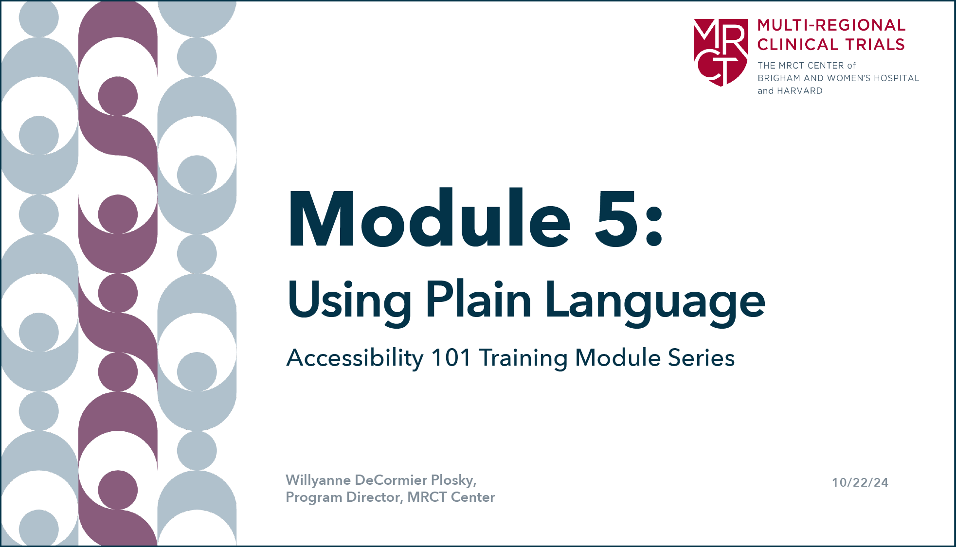 “Developing Accessible PowerPoints” is the sixth module in the Accessibility 101 Training series that the MRCT Center has developed to complement the Accessibility by Design (AbD) in Clinical Research Toolkit. Module 6 provides a background on PowerPoints and usage in the expanding world of webinars, instructions on how to develop accessible PowerPoints and an exercise to test the user’s skills with plain language. The “how-to” section of the training starts with defining the intended purpose and audience for the PowerPoint; describes design for mental processing, readability, and sensory processing; reviews elements described in other modules (e.g., Alt Text, color contrast, plain language/inclusive language); and concludes by highlighting considerations to support accessibility while the PowerPoint is presented (e.g., closed captioning).